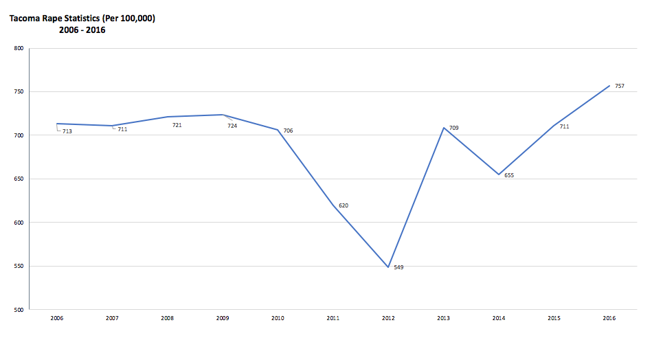 - Tacoma’s rape crime rate peaked in 2018 at 98.3 per 100,000 people